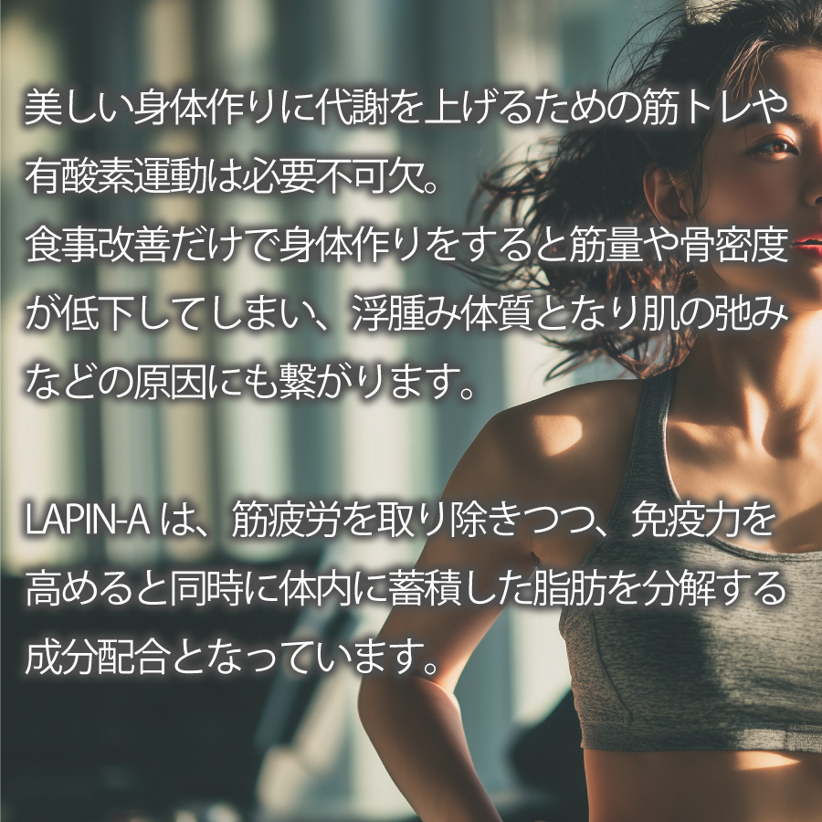 筋疲労を取り除きつつ、免疫力を高めると同時に体内に蓄積した脂肪を分解する成分配合となっています。